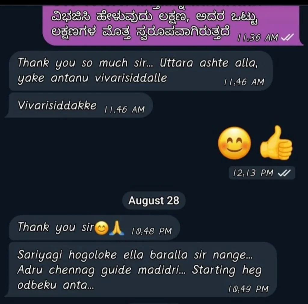 ಸರಳವಾಗಿ ಉತ್ತರ ಬರೆದು ಹೆಚ್ಚು ಅಂಕಗಳನ್ನು ಹೇಗೆ ಪಡೆಯಬೇಕೆಂದು ತಿಳಿಸುದಲ್ಲದೆ , ಅವರೇ ಕೆಲ ಕಷ್ಟ ಉತ್ತರಗಳಿಗೆ ಮಾದರಿ ಉತ್ತರ ನೀಡಿ ನನ್ನ optional ಪತ್ರಿಕೆಯ ತಯಾರಿಯನ್ನು ಸುಲಭಗೊಳಿಸಿದ್ದಾರೆ , ಇವರ ತರಬೇತಿಯಿಂದಾಗಿಯೇ ಕನ್ನಡ optional ನಲ್ಲಿ ನನ್ನ ಆತ್ಮ ವಿಶ್ವಾಸ ಹೆಚ್ಚಾಯಿತು.